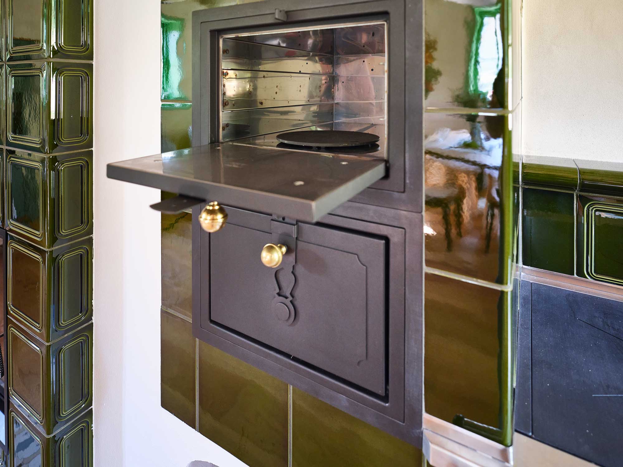 Na ľavej strane sa nachádza sálavá pec, nadimenzovaná na 6 kg dreva, s 12-hodinovým prikladacím cyklom. Vďaka akumulačnej schopnosti sála teplo dlhodobo a rovnomerne, čím vytvára stabilnú klímu v interiéri.